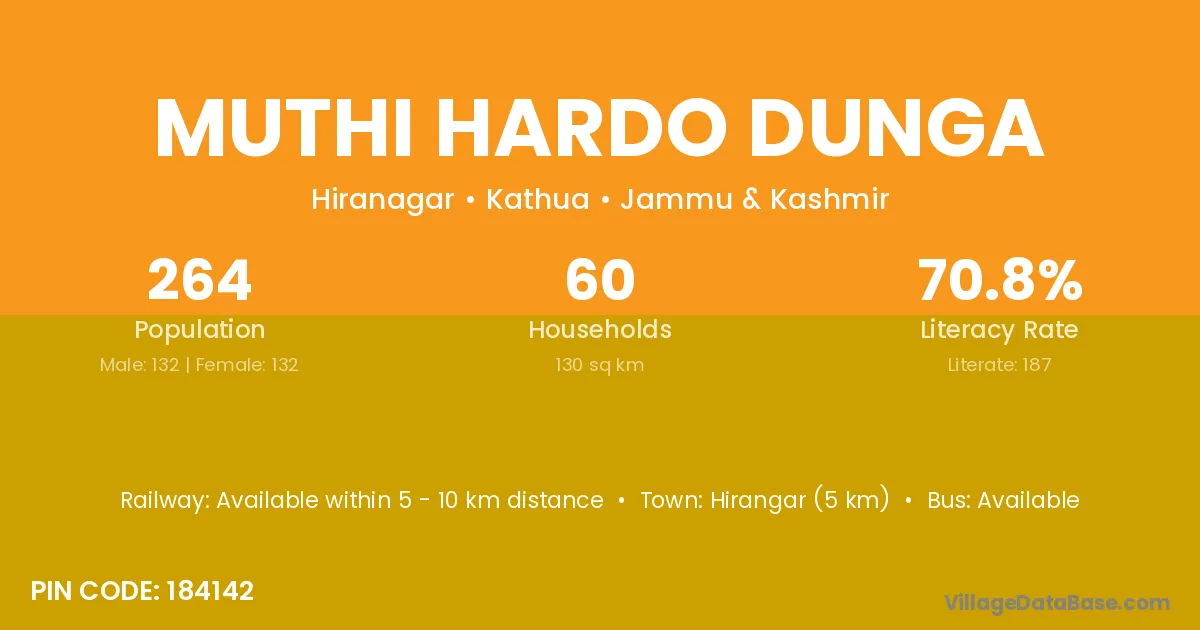 Muthi Hardo Dunga village has a total population of 264 people, of which 132 are males and 132 are females.