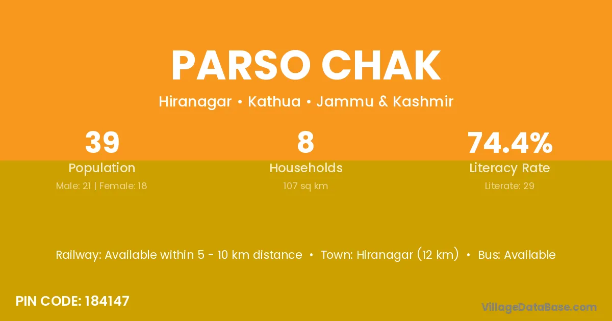 Hiranagar (12 km) is the nearest town to Parso Chak village for major economic activities and is located approximately 12 km away.
