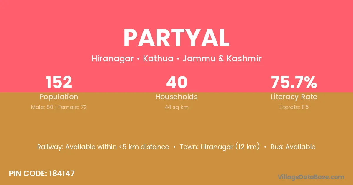 Hiranagar (12 km) is the nearest town to Partyal village for major economic activities and is located approximately 12 km away.