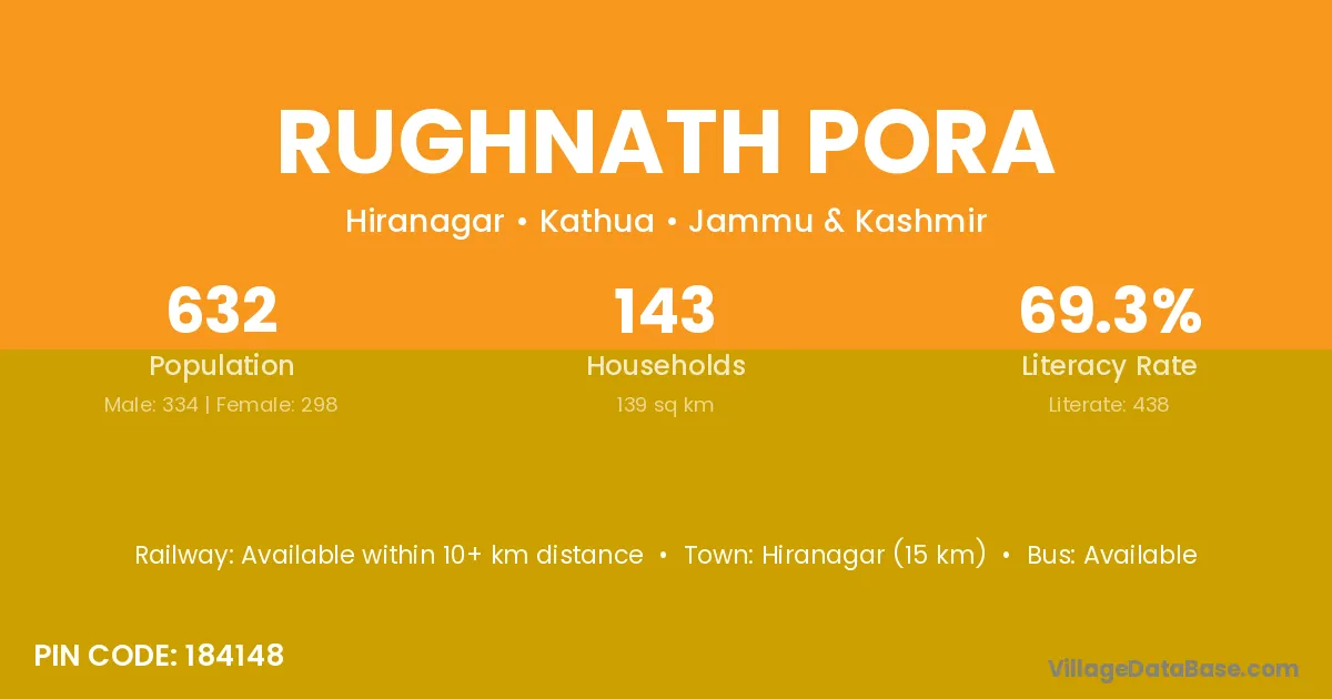 Hiranagar (15 km) is the nearest town to Rughnath Pora village for major economic activities and is located approximately 15 km away.