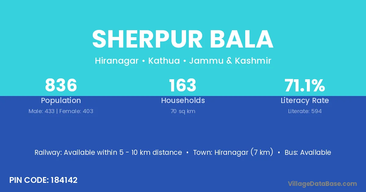 Hiranagar (7 km) is the nearest town to Sherpur Bala village for major economic activities and is located approximately 7 km away.