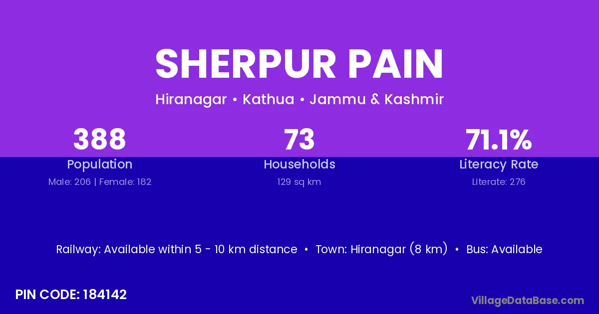Hiranagar (8 km) is the nearest town to Sherpur Pain village for major economic activities and is located approximately 8 km away.