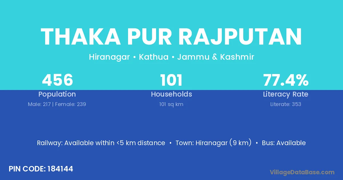 Hiranagar (9 km) is the nearest town to Thaka Pur Rajputan village for major economic activities and is located approximately 9 km away.