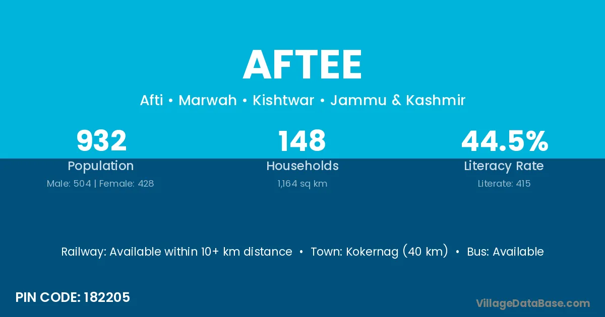 Kokernag (40 km) is the nearest town to Aftee village for major economic activities and is located approximately 40 km away.