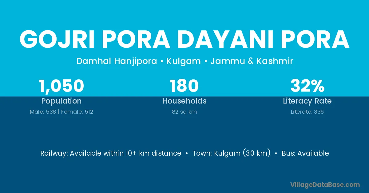 Gojri Pora Dayani Pora village has a total population of 1,050 people, of which 538 are males and 512 are females.