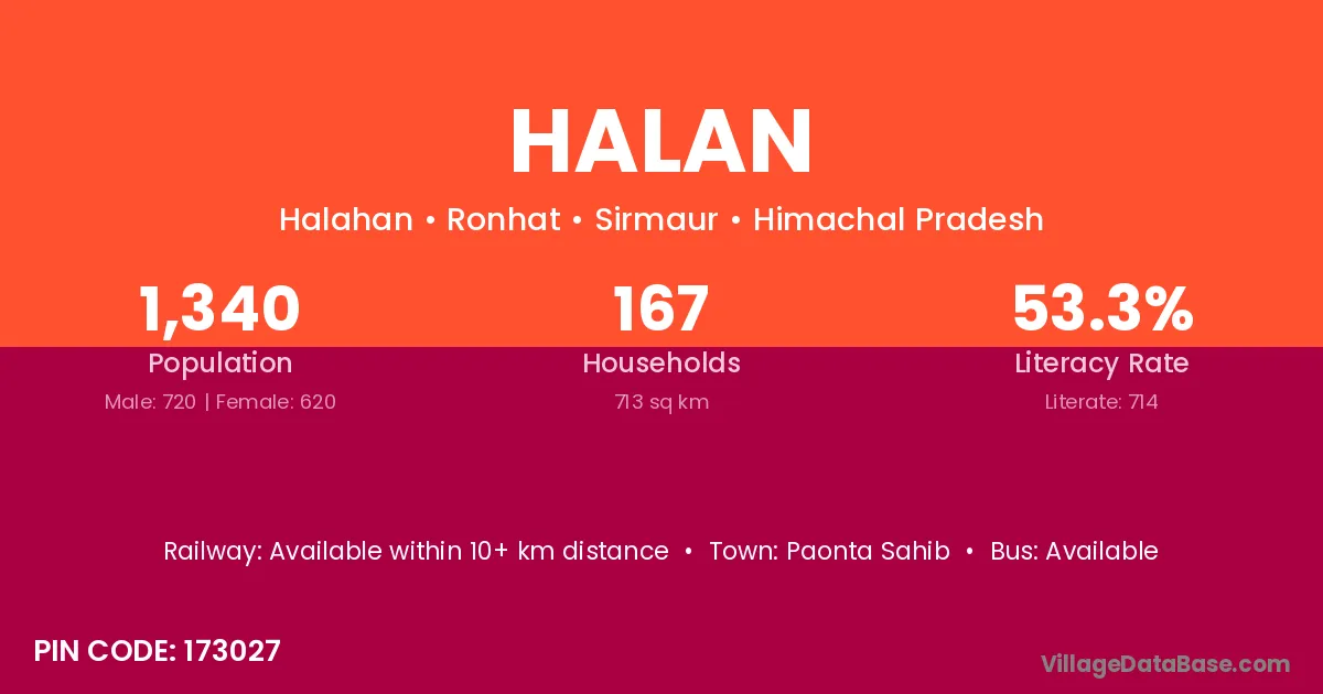 The literacy rate of Halan village is 14.47%. Male literacy stands at 19.95% and female literacy at 8.73%.