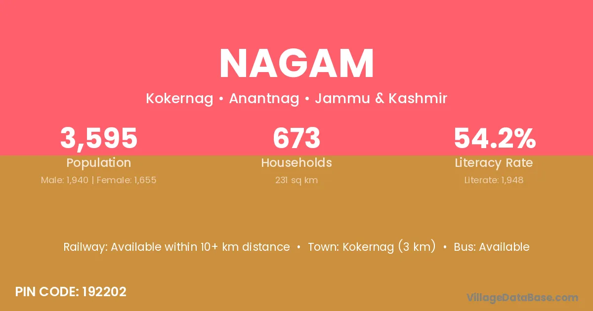 Kulgam (30 km) is the nearest town to Nagam village for major economic activities and is located approximately 30 km away.