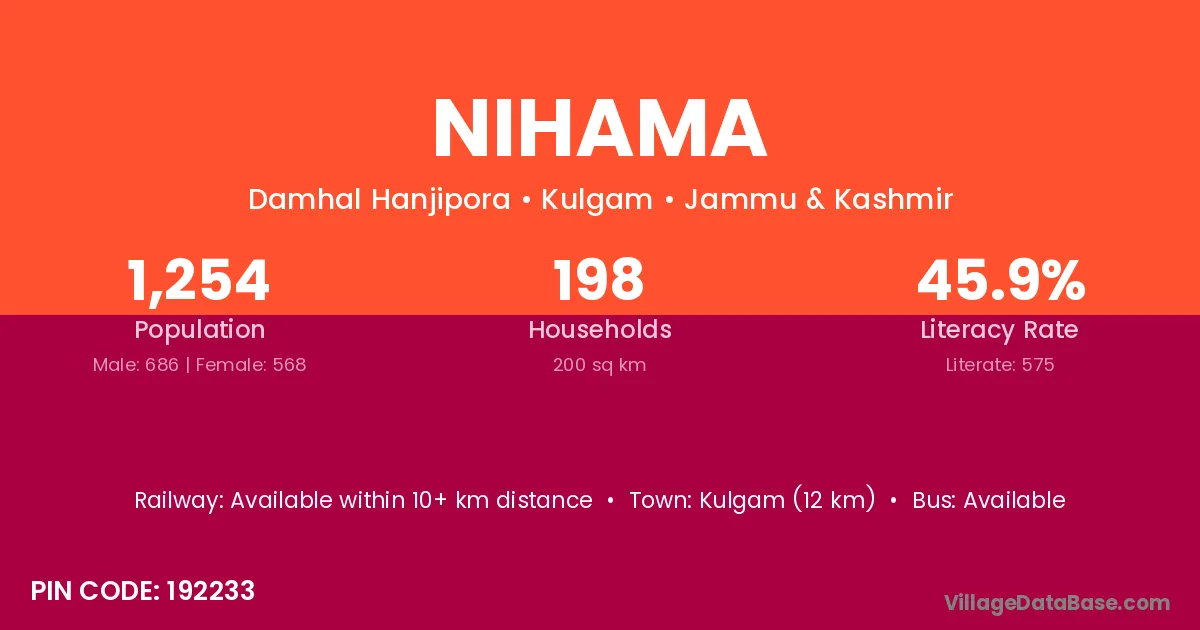 Kulgam (12 km) is the nearest town to Nihama village for major economic activities and is located approximately 12 km away.