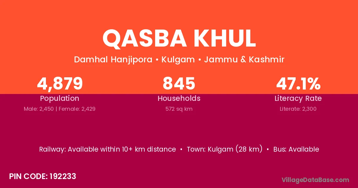 Qasba Khul village has a total population of 4,879 people, of which 2,450 are males and 2,429 are females.