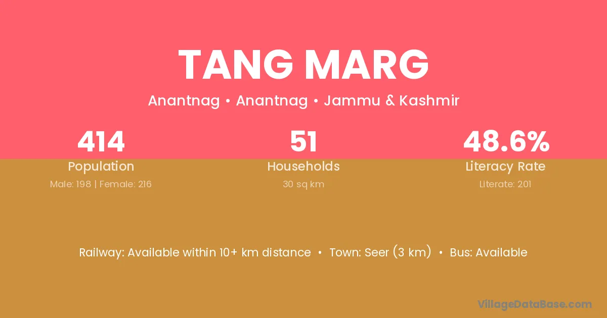 Kulgam (25 km) is the nearest town to Tang Marg village for major economic activities and is located approximately 25 km away.