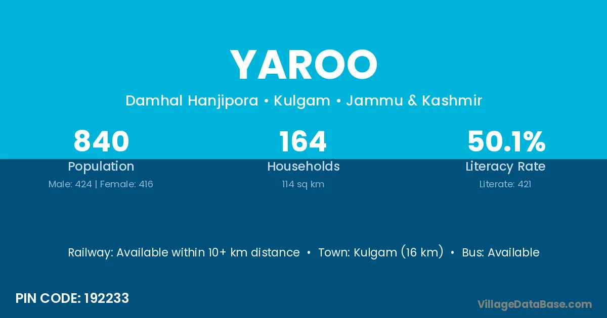 Kulgam (16 km) is the nearest town to Yaroo village for major economic activities and is located approximately 16 km away.