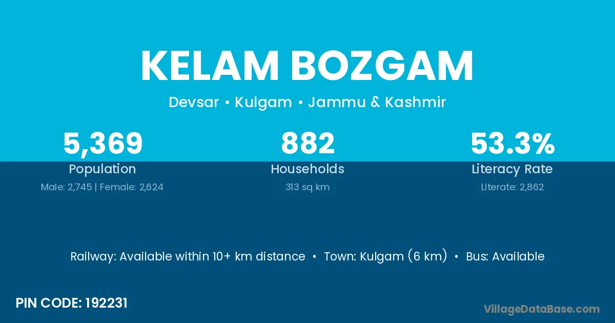 Kelam Bozgam village has a total population of 5,369 people, of which 2,745 are males and 2,624 are females.
