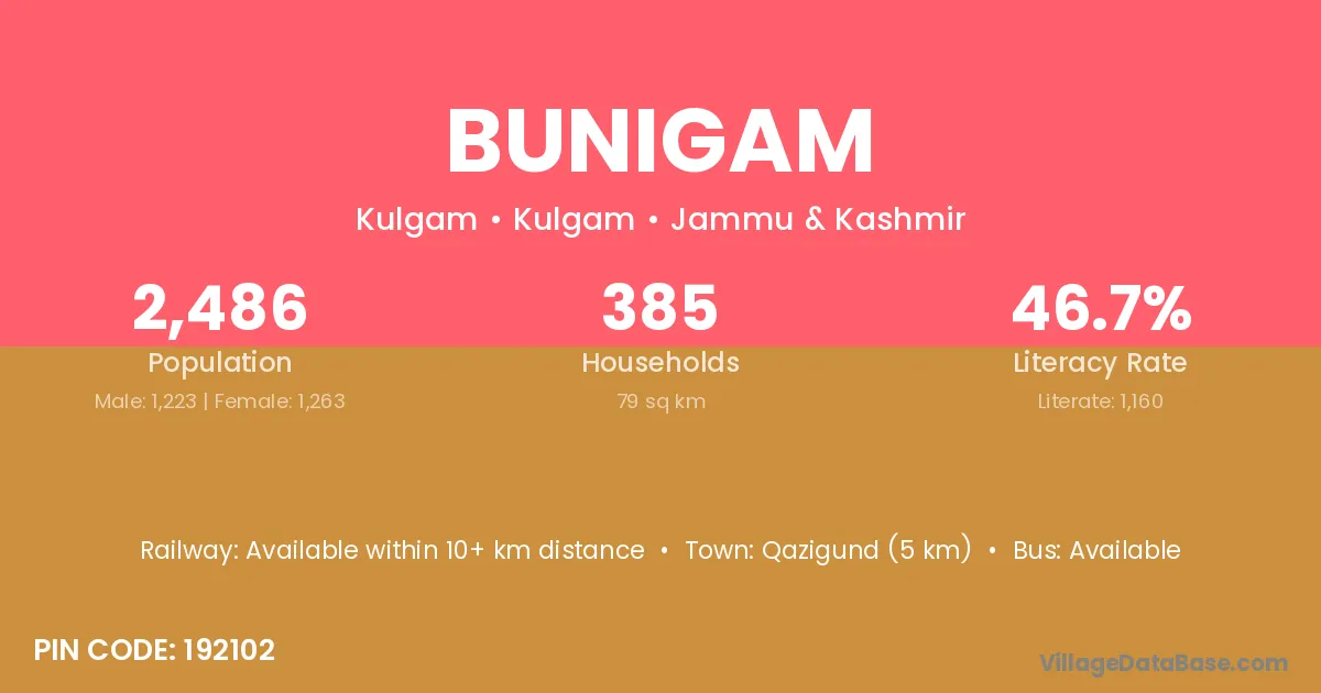 Qazigund (5 km) is the nearest town to Bunigam village for major economic activities and is located approximately 5 km away.