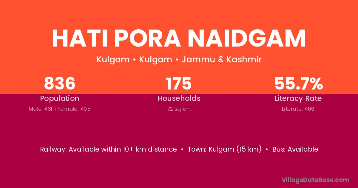 Hati Pora Naidgam village has a total population of 836 people, of which 431 are males and 405 are females.