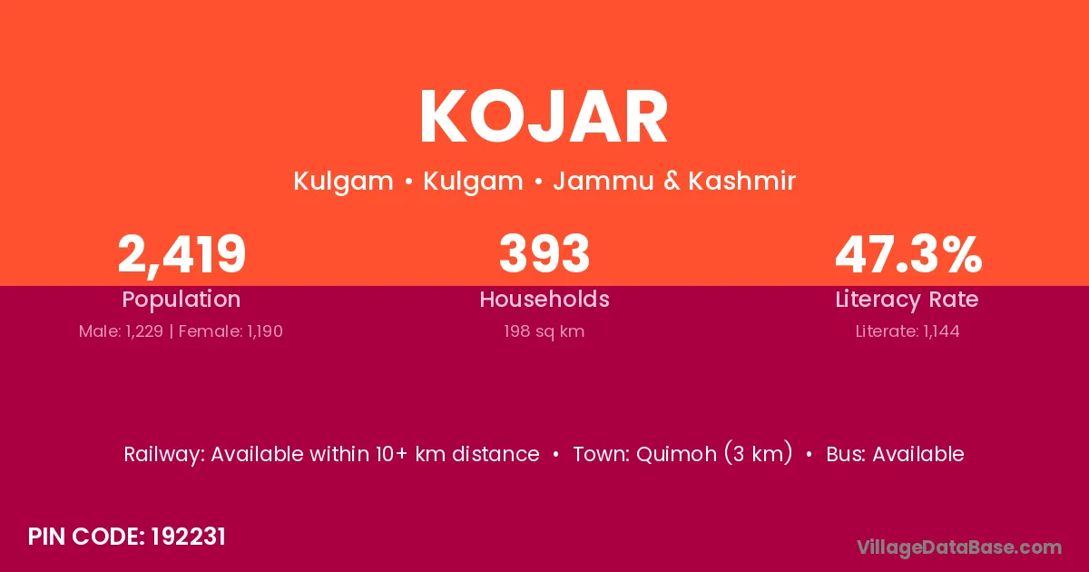 Kojar village has a total population of 2,419 people, of which 1,229 are males and 1,190 are females.