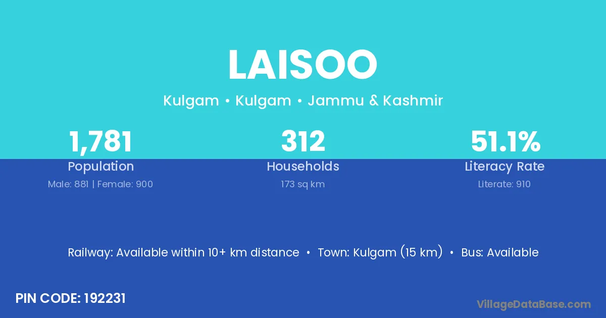 Kulgam (15 km) is the nearest town to Laisoo village for major economic activities and is located approximately 15 km away.