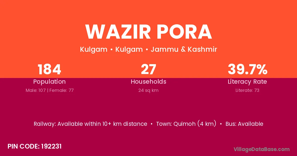 Wazir Pora village has a total population of 184 people, of which 107 are males and 77 are females.