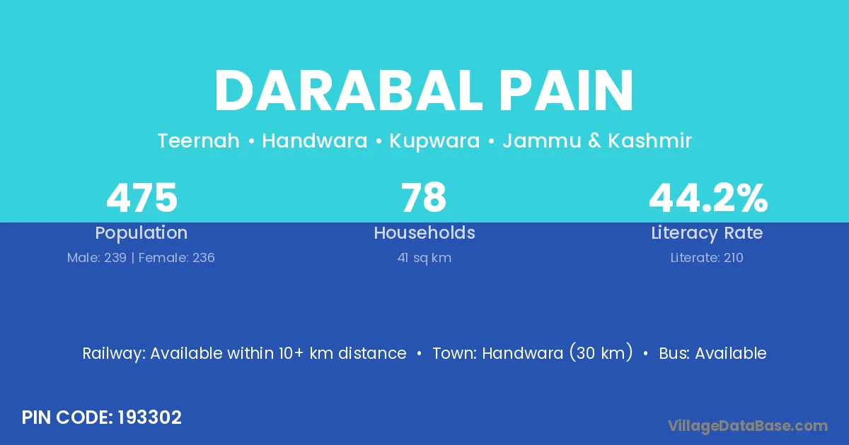 Handwara (30 km) is the nearest town to Darabal Pain village for major economic activities and is located approximately 30 km away.