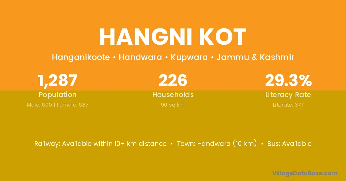 Handwara (10 km) is the nearest town to Hangni Kot village for major economic activities and is located approximately 10 km away.