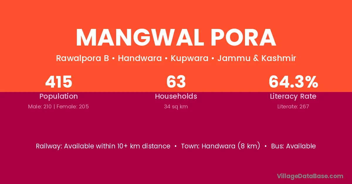 Handwara (8 km) is the nearest town to Mangwal Pora village for major economic activities and is located approximately 8 km away.