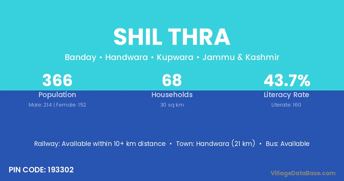 Handwara (21 km) is the nearest town to Shil Thra village for major economic activities and is located approximately 21 km away.