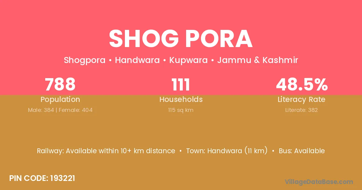 Handwara (11 km) is the nearest town to Shog Pora village for major economic activities and is located approximately 11 km away.