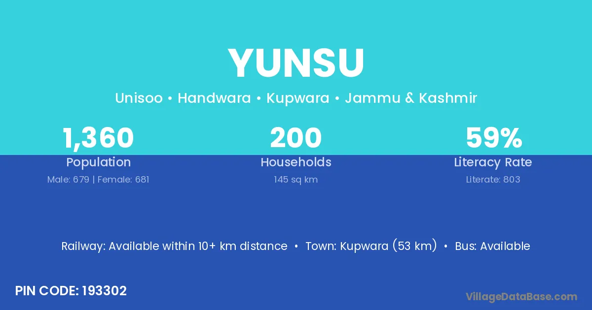 Kupwara (53 km) is the nearest town to Yunsu village for major economic activities and is located approximately 53 km away.