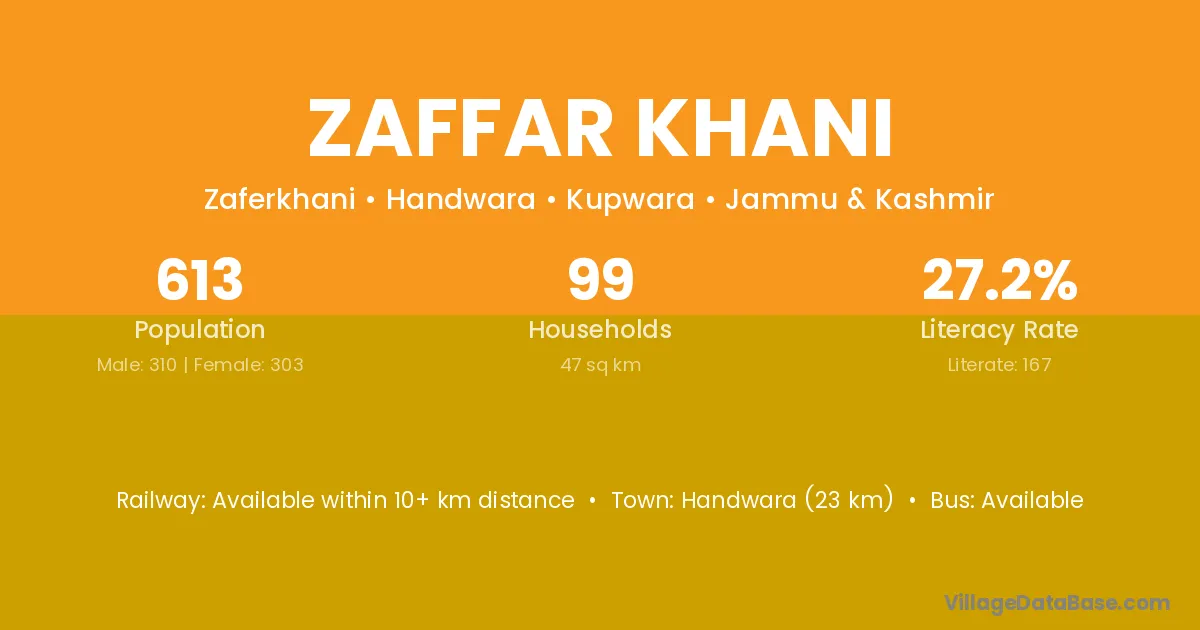 Handwara (23 km) is the nearest town to Zaffar Khani village for major economic activities and is located approximately 23 km away.