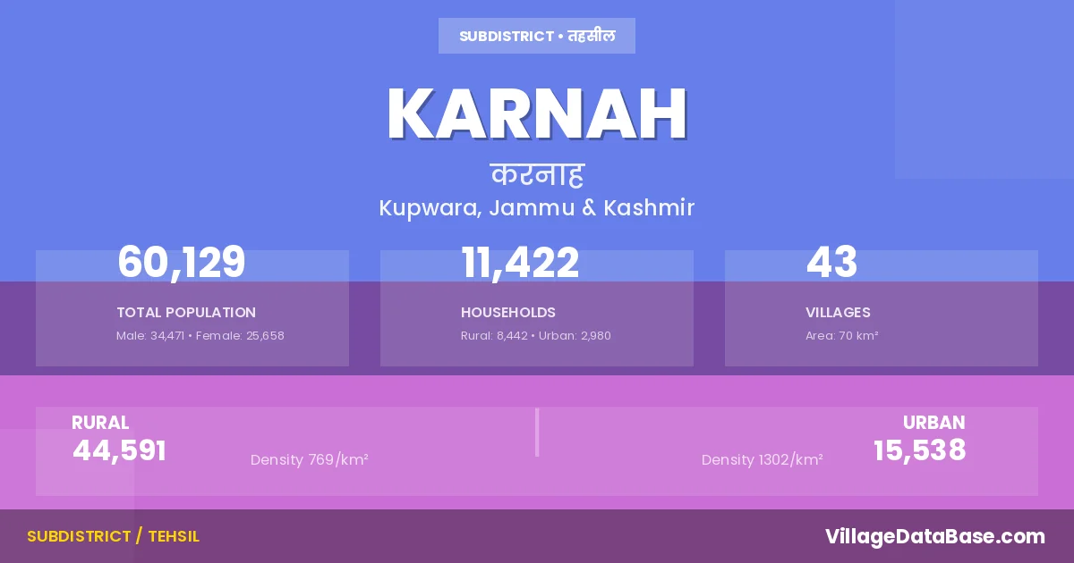 According to the 2011 census The total area of Karnah Tehsil is 70 km², with a population of 60129 people. The population density is 860 inhabitants per square kilometre, and there are approximately 11422 houses in the sub district.