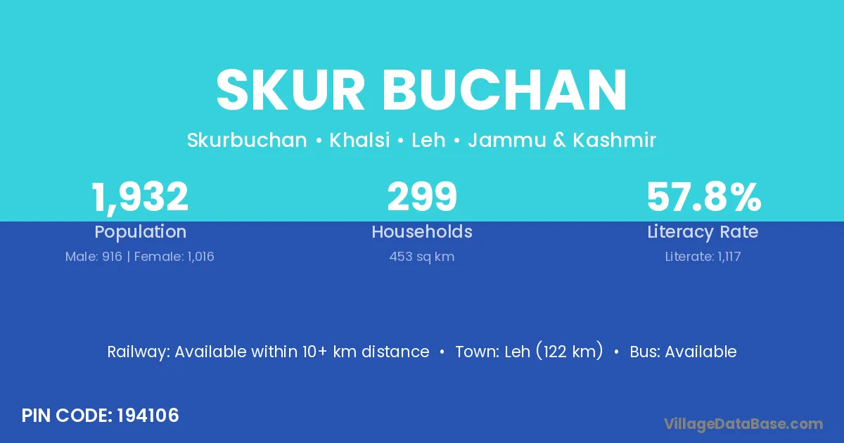 Leh (122 km) is the nearest town to Skur Buchan village for major economic activities and is located approximately 122 km away.