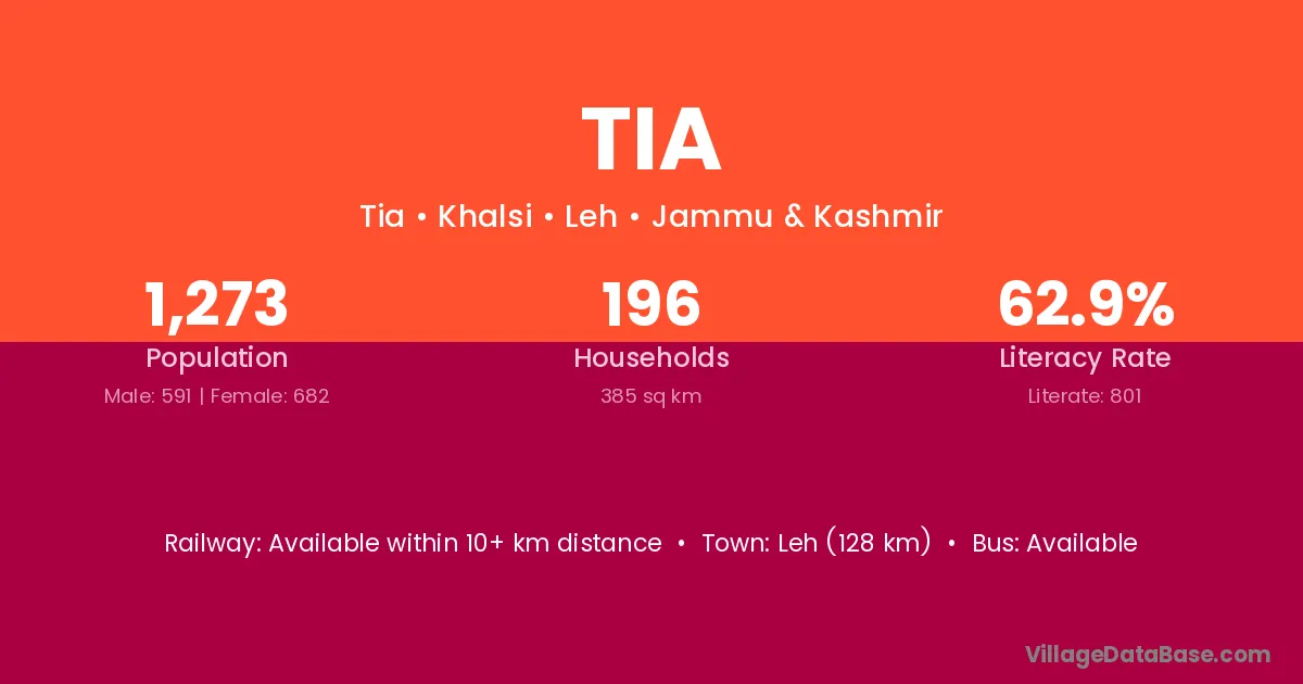 Leh (128 km) is the nearest town to Tia village for major economic activities and is located approximately 128 km away.