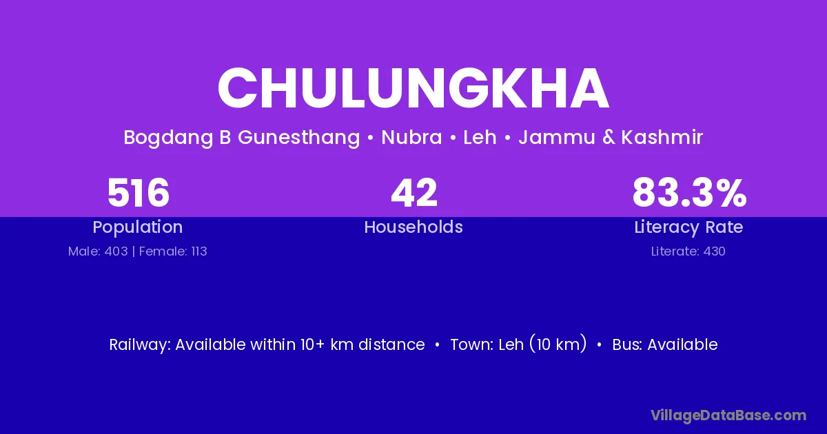 Leh (10 km) is the nearest town to Chulungkha village for major economic activities and is located approximately 10 km away.