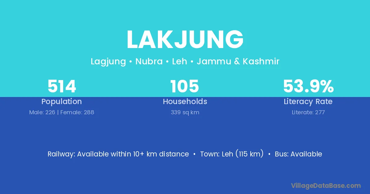 Leh (115 km) is the nearest town to Lakjung village for major economic activities and is located approximately 115 km away.