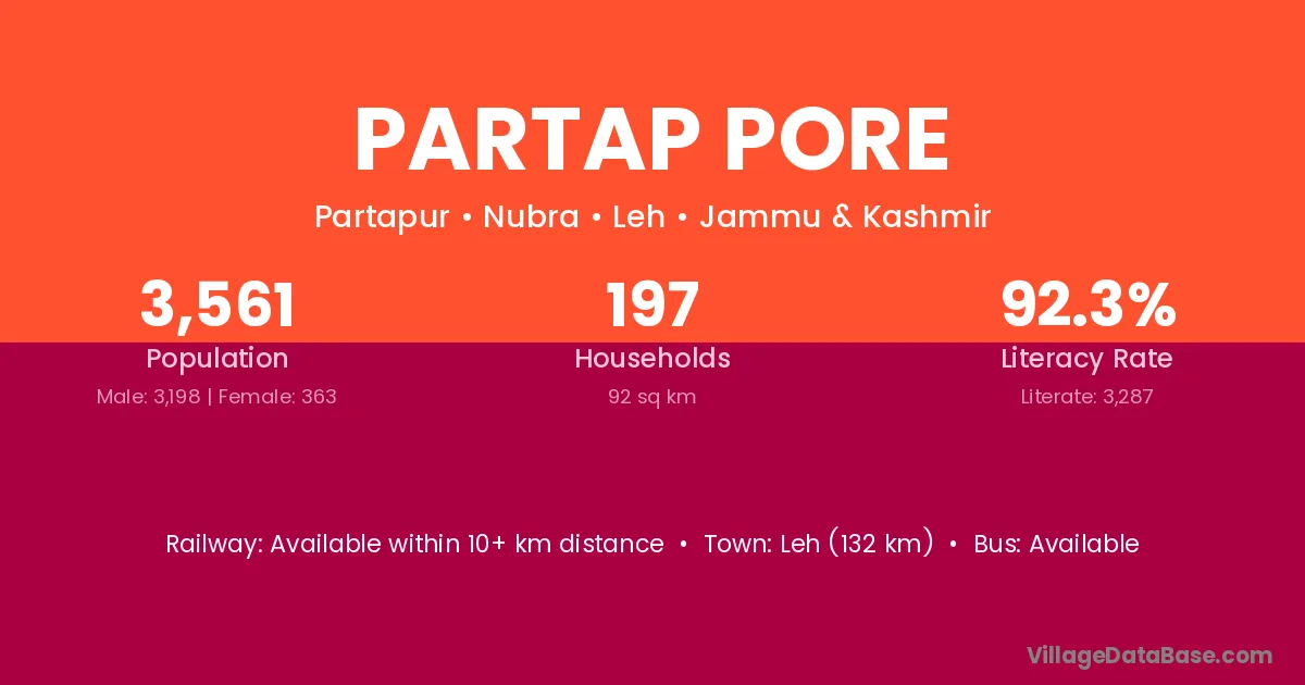 Leh (132 km) is the nearest town to Partap Pore village for major economic activities and is located approximately 132 km away.