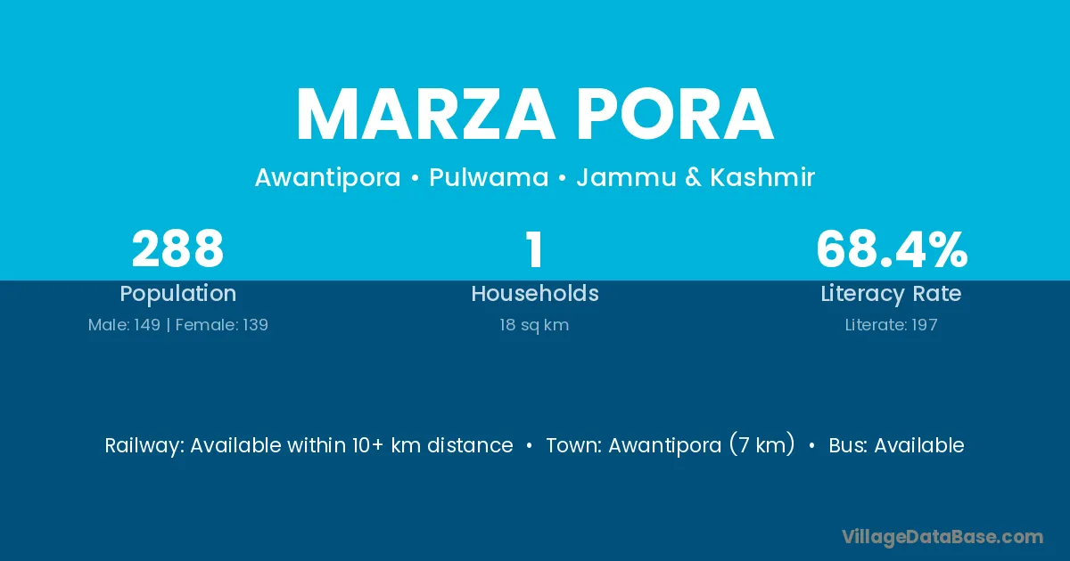 Awantipora (7 km) is the nearest town to Marza Pora village for major economic activities and is located approximately 7 km away.