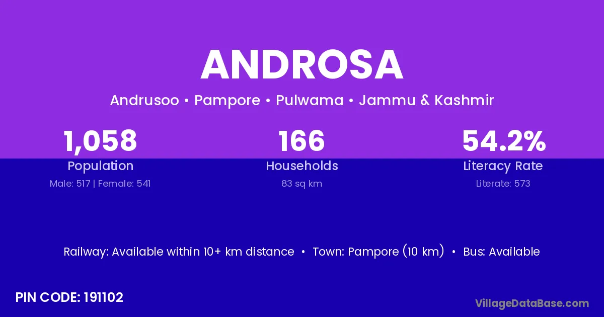 Pampore (10 km) is the nearest town to Androsa village for major economic activities and is located approximately 10 km away.