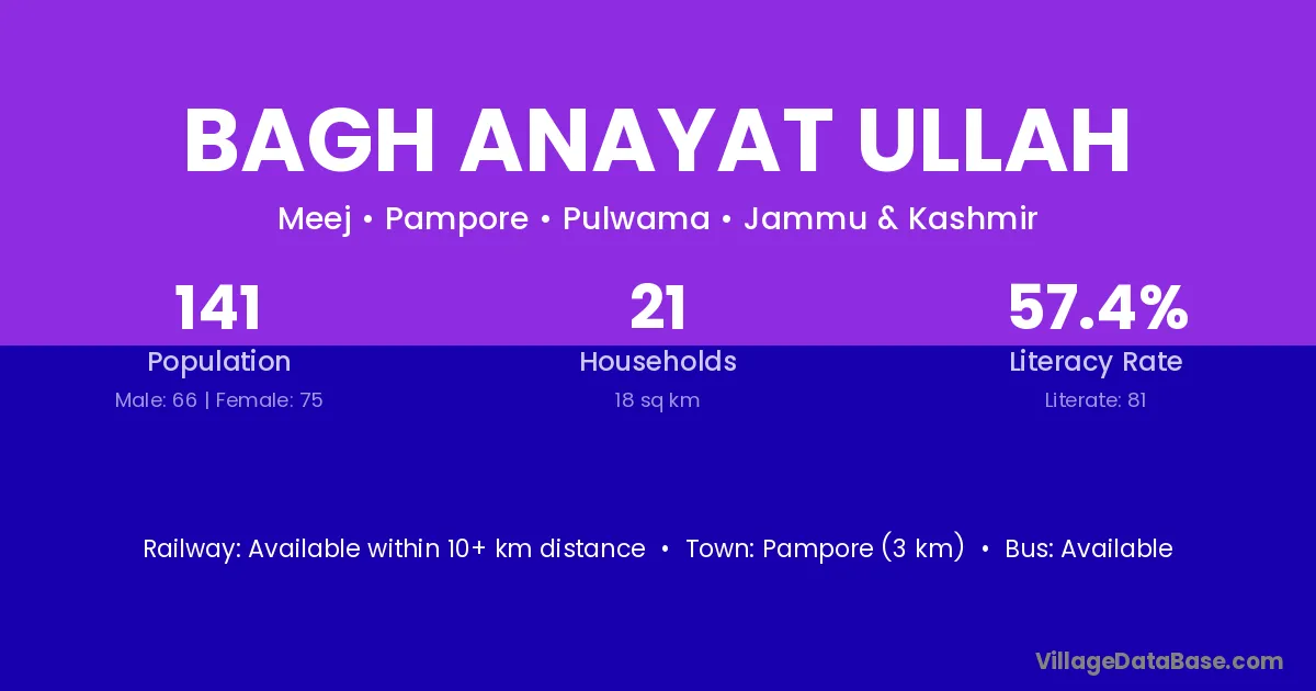 Pampore (3 km) is the nearest town to Bagh Anayat Ullah village for major economic activities and is located approximately 3 km away.