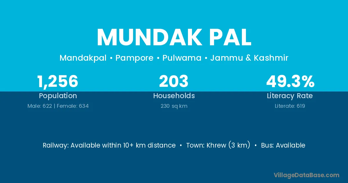 Khrew (3 km) is the nearest town to Mundak Pal village for major economic activities and is located approximately 3 km away.