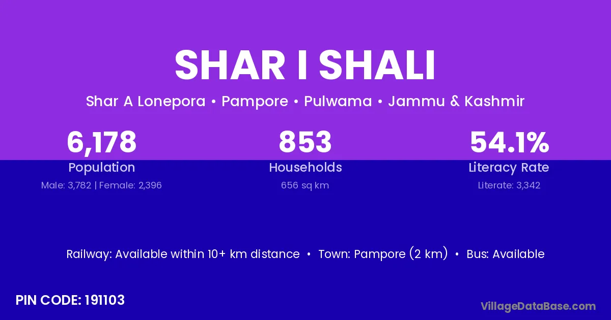 Pampore (2 km) is the nearest town to Shar I Shali village for major economic activities and is located approximately 2 km away.