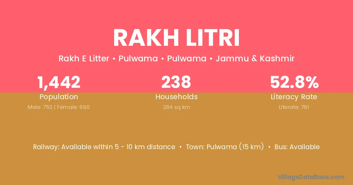 Pulwama (15 km) is the nearest town to Rakh Litri village for major economic activities and is located approximately 15 km away.