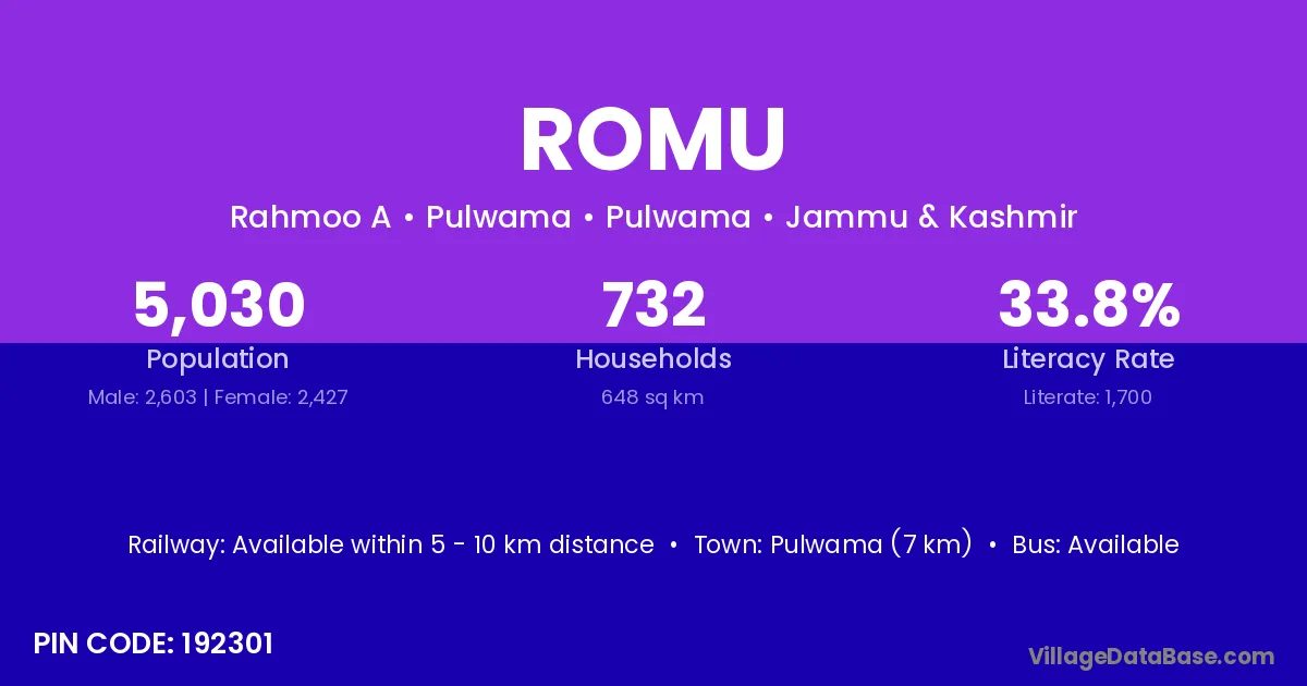 Pulwama (7 km) is the nearest town to Romu village for major economic activities and is located approximately 7 km away.