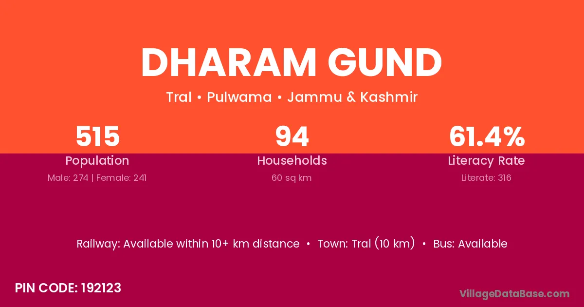Tral (10 km) is the nearest town to Dharam Gund village for major economic activities and is located approximately 10 km away.