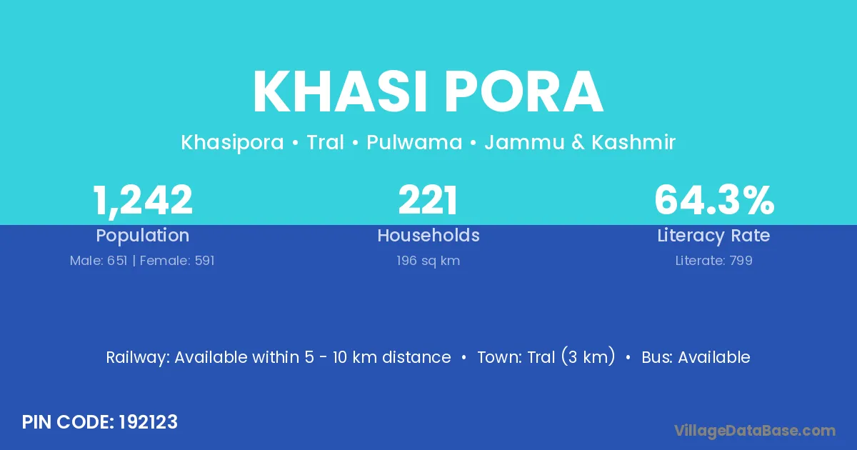 Tral (3 km) is the nearest town to Khasi Pora village for major economic activities and is located approximately 3 km away.