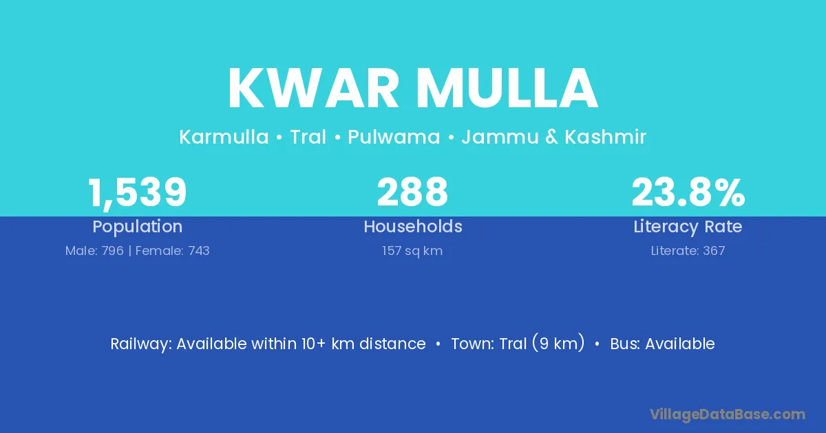 Kwar Mulla village has a total population of 1,539 people, of which 796 are males and 743 are females.