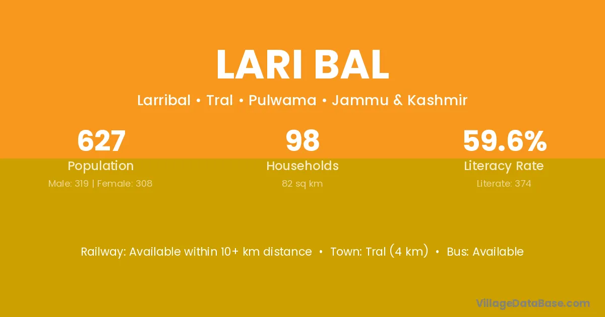 Tral (4 km) is the nearest town to Lari Bal village for major economic activities and is located approximately 4 km away.