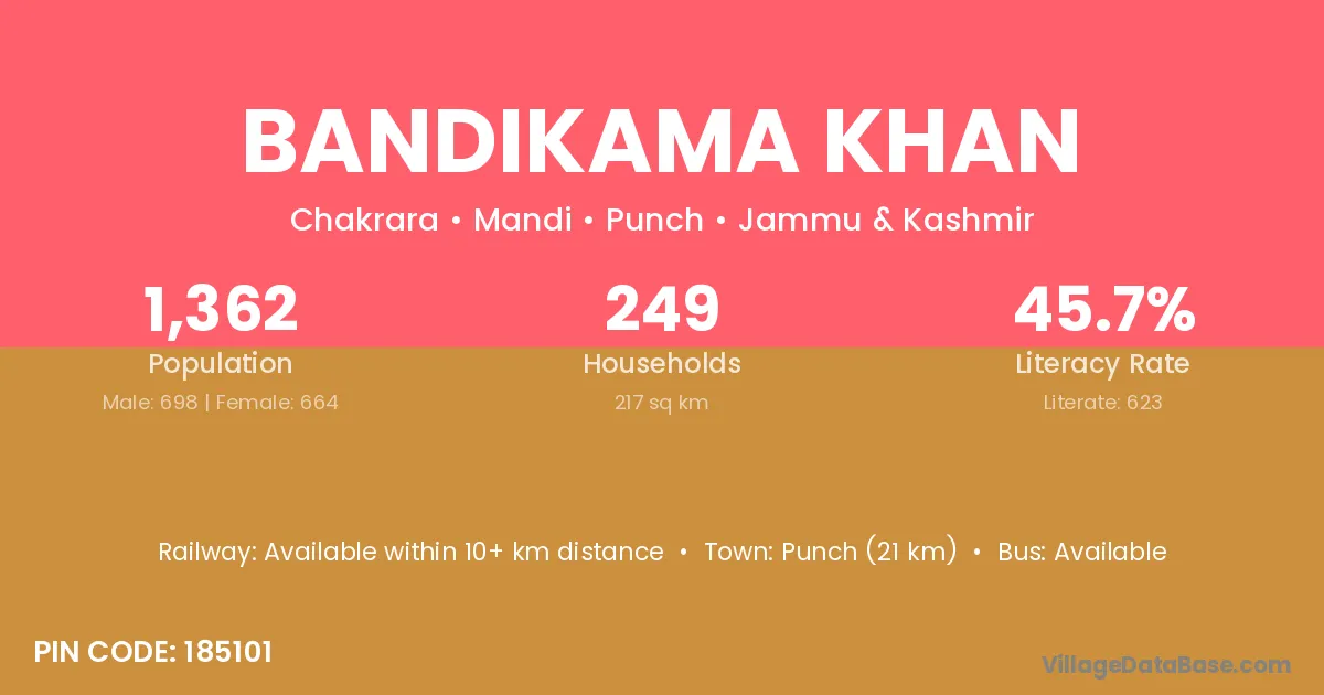 Punch (21 km) is the nearest town to Bandikama Khan village for major economic activities and is located approximately 21 km away.