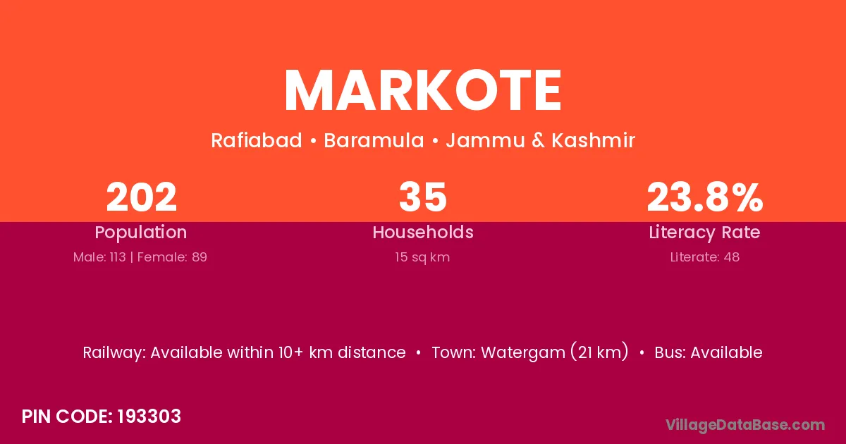 The literacy rate of Markote village is 34.08%. Male literacy stands at 44.23% and female literacy at 22.75%.