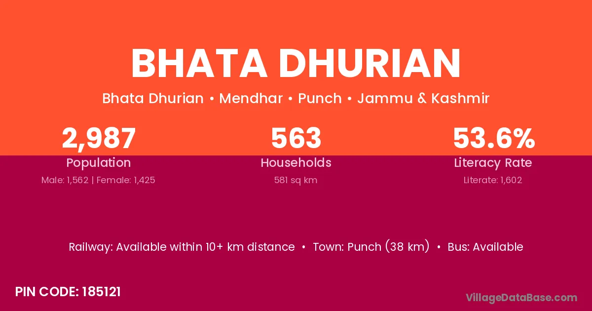 Punch (38 km) is the nearest town to Bhata Dhurian village for major economic activities and is located approximately 38 km away.
