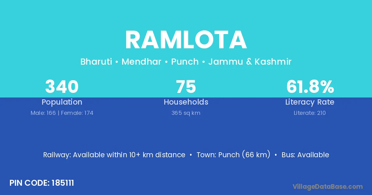 Punch (66 km) is the nearest town to Ramlota village for major economic activities and is located approximately 66 km away.