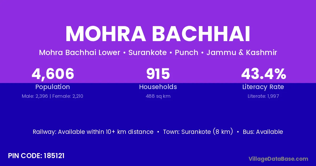 Surankote (8 km) is the nearest town to Mohra Bachhai village for major economic activities and is located approximately 8 km away.